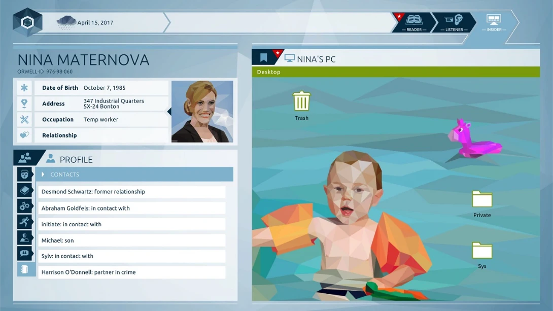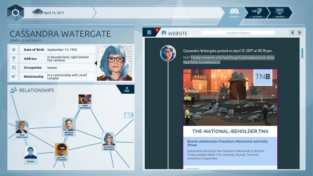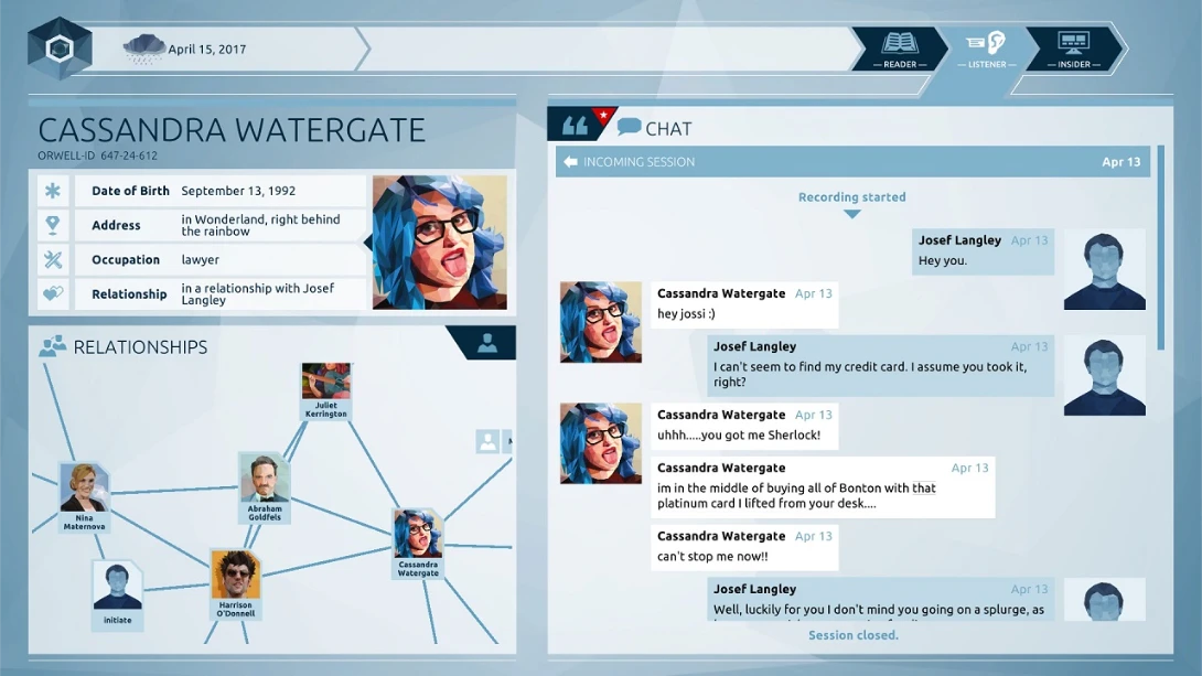 《Orwell: Keeping an Eye On You》是一款2016年文字冒险游戏,由Osmotic Studios开发。你扮演政府调查员,通过监控公民的社交媒体、通讯和文件来追踪恐怖分子。游戏用鼠标操作,核心是信息筛选和道德抉择,结局会因你的选择而改变。