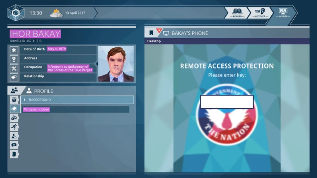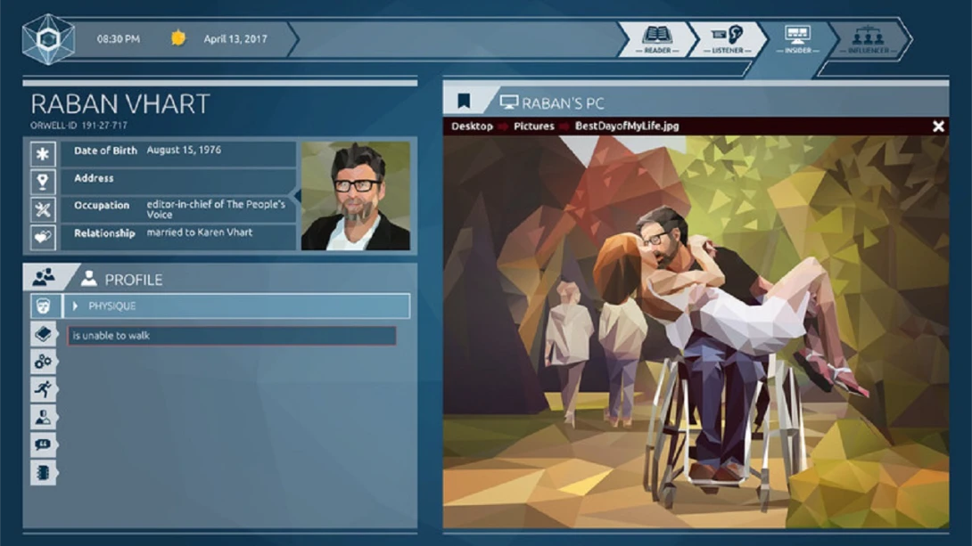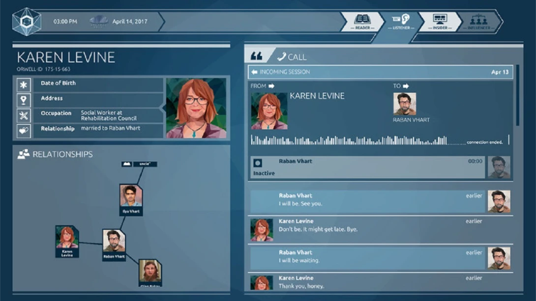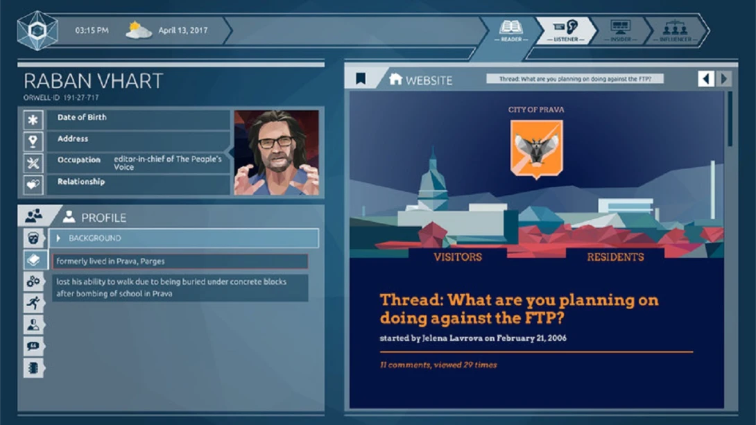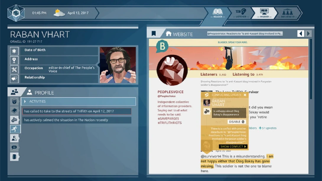 《Orwell: Ignorance is Strength》是一款2018年发行的反乌托邦政治模拟游戏,由Osmotic Studios开发,作为《Orwell: Keeping an Eye on You》的续作,你扮演Orwell系统的调查员,通过监控和分析数字足迹来追踪潜在威胁,但核心新增了“揭露和玩弄真相”的力量,可以主动选择揭露事实或篡改信息以操控舆论。游戏分三章发布,每个章节聚焦不同事件,主题更黑暗,深入探讨虚假信息和权力腐蚀,结局由你的道德抉择决定。